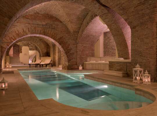The wellness area has genuine wow factor with a heated indoor pool with a transparent base showing ancient Etruscan walls below.