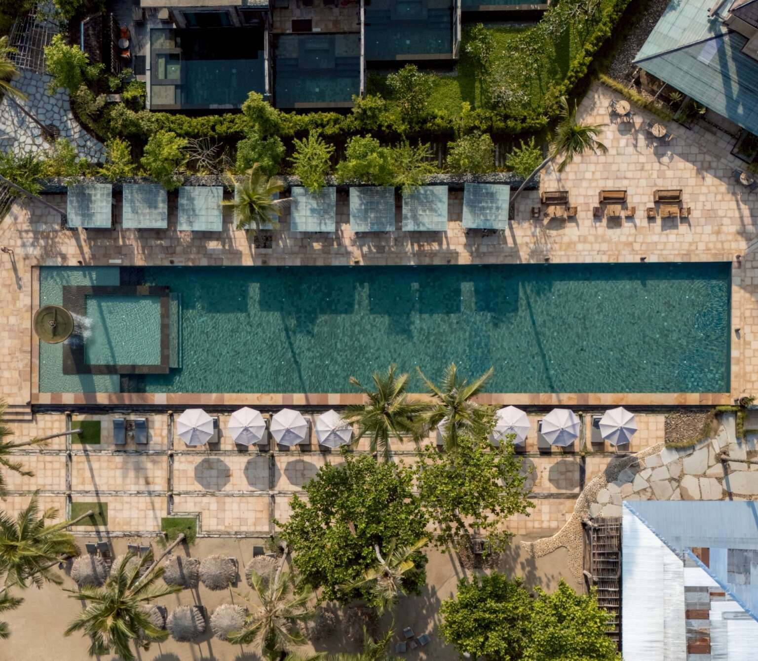 These peaceful cottages are dotted around a tropical cove lined by a beautiful sandy beach.